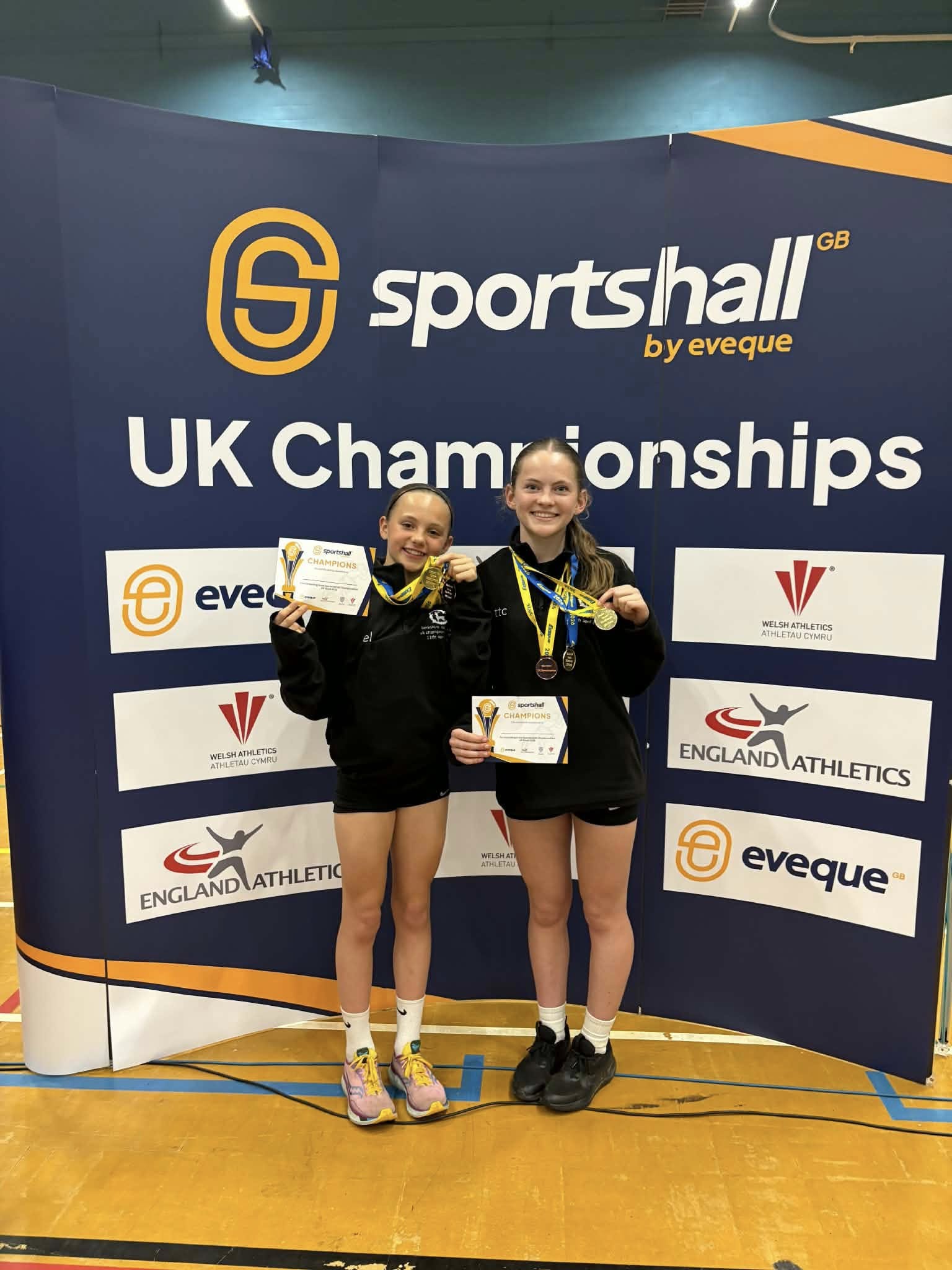 At the National UK Sportshall competition this weekend Team Berkshire U13 girls won. Two local athletes from Team Kennet were part of the team, Ella Larkin took individual gold for the 6 lap time trial and another gold in 8 lap Paarlouf time trial. Matilda Clare individual bronze in 4 laps time trial and gold in 4×2 laps relay team.